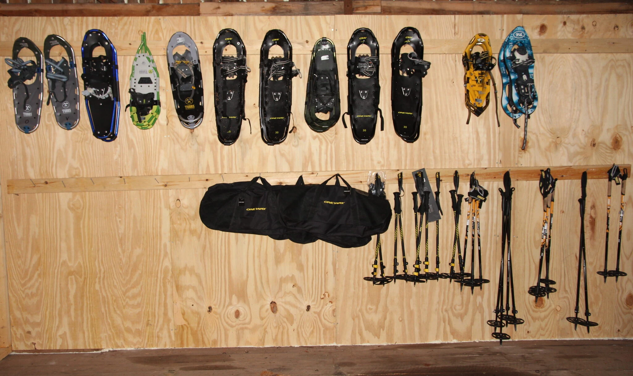 Aikuisten lumikenkiä yhteensä 11 paria. Varaukseen kuuluu lumikengät ja säädettävät teleskooppisauvat. Valikoimassa erilaisia malleja.